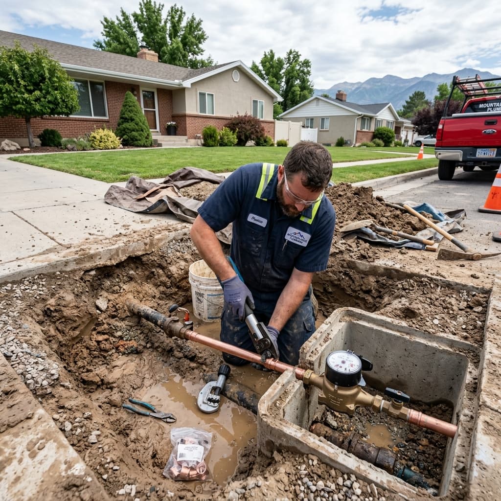The main water line is the pipe that carries pressurized water from the city meter at the street to your home. In Northern Utah, these lines are typically 3/4-inch or 1-inch copper, galvanized steel, or polybutylene in older homes, and PEX or copper in newer construction. Because the line is buried 3–5 feet underground and under constant pressure, even a small leak wastes thousands of gallons and can undermine your foundation, driveway, or landscaping.